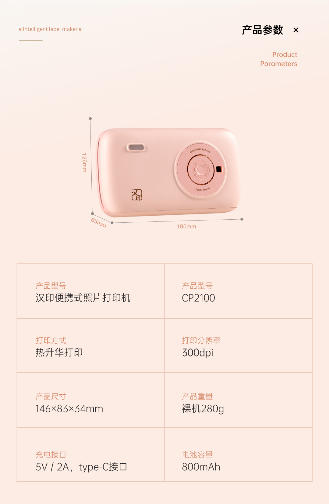 商品名称:汉印照片打印机CP2100手机迷你便携式口袋热升华彩色高清三寸小型蓝牙无线连接相片冲印1台 樱花粉