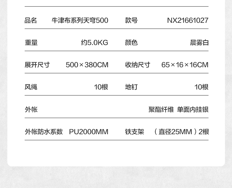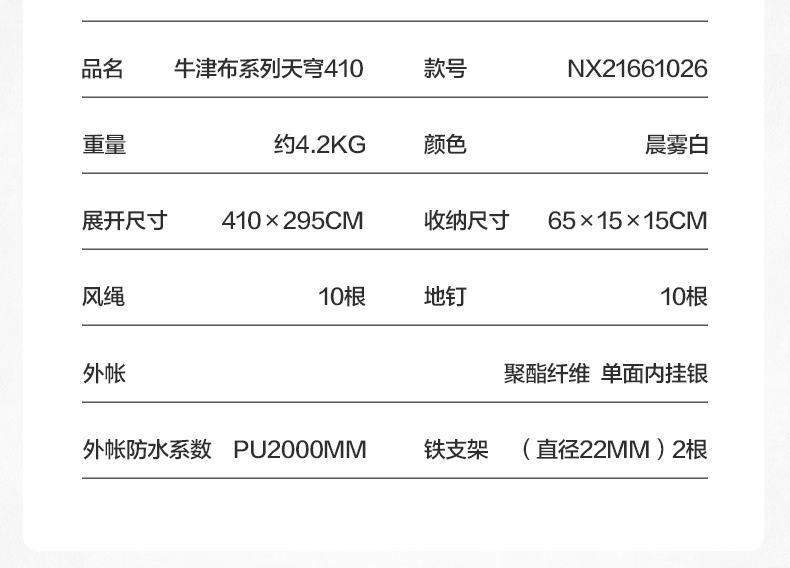 商品名称:牧高笛(MOBIGARDEN)牛津布系列天幕 天穹410 NX21661026/个 晨雾白