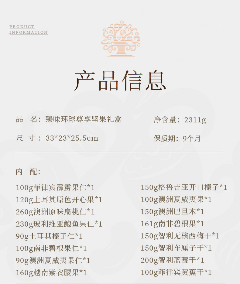 商品名称:臻味环球尊享坚果礼盒 2.311kg单位:盒 枫叶色