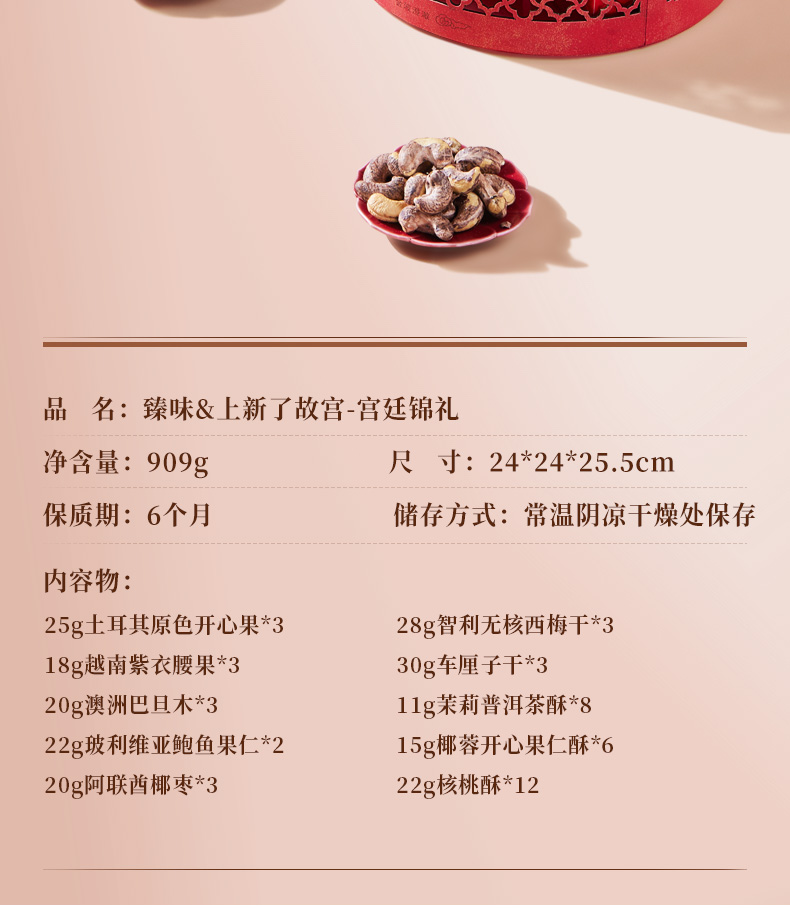 商品名称:臻味&上新了故宫宫廷锦礼糕点+坚果礼盒 909g 单位:盒 红色