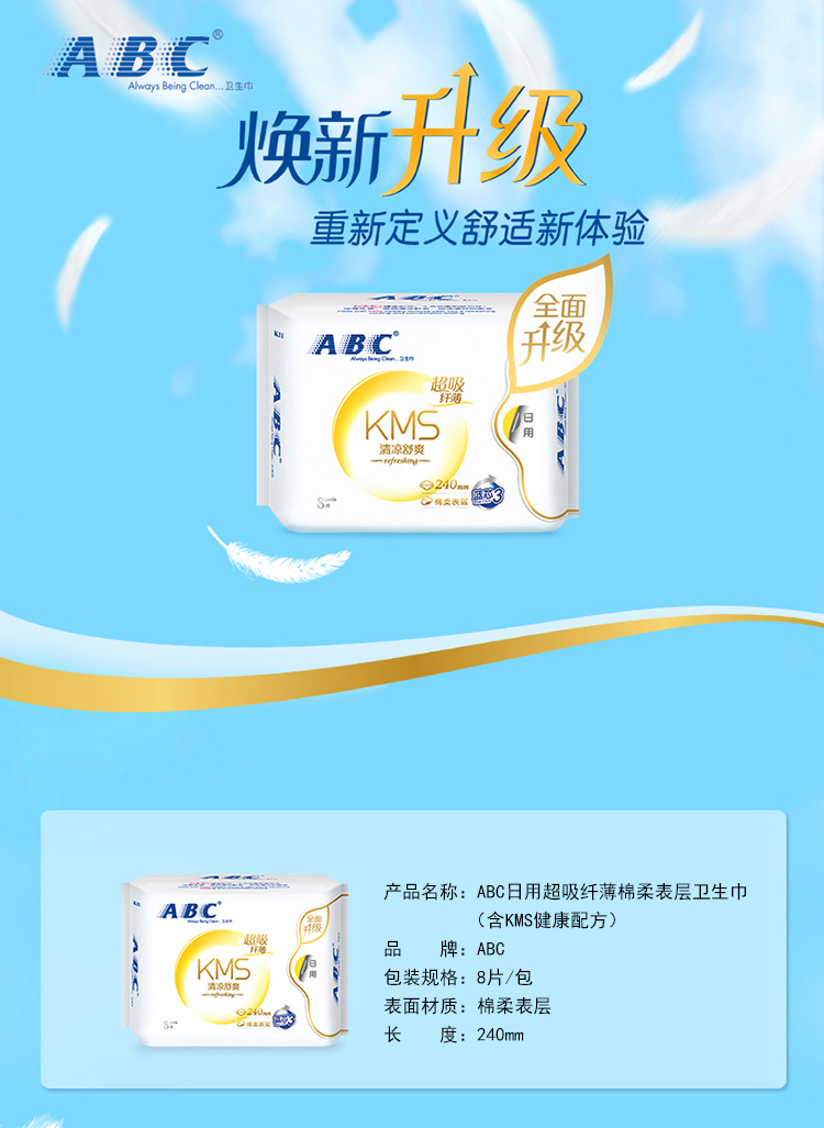 商品名称:ABC纤薄绵柔表层日用卫生巾8片*11包(只发江浙沪)