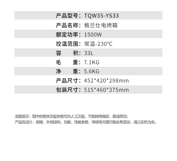 商品名称:Galanz格兰仕 TQW35-YS33 33L/机械式 烤箱(单位:台)