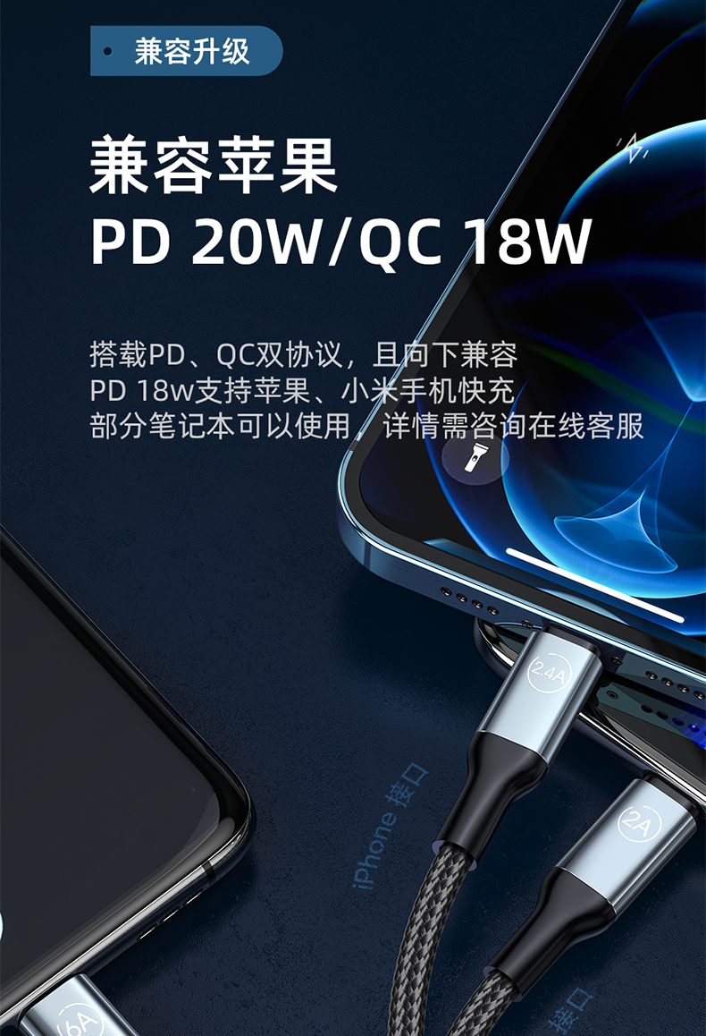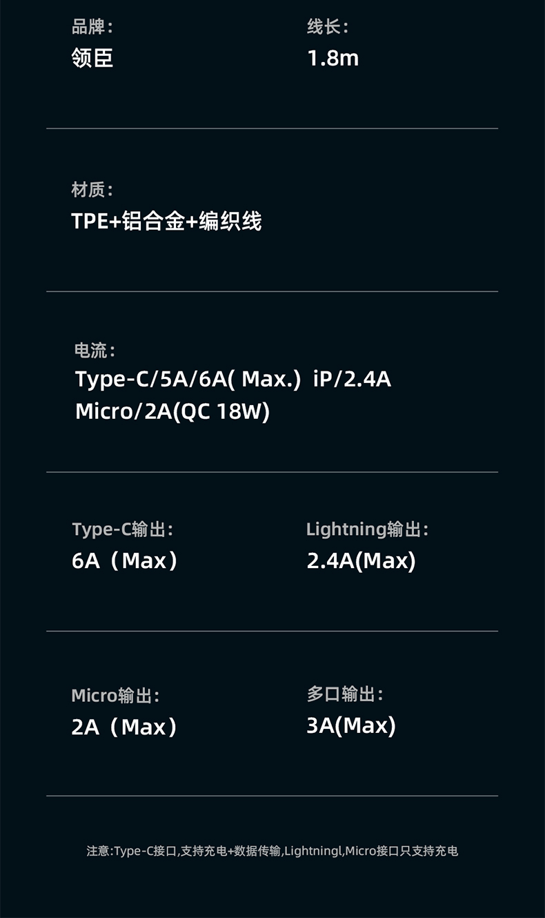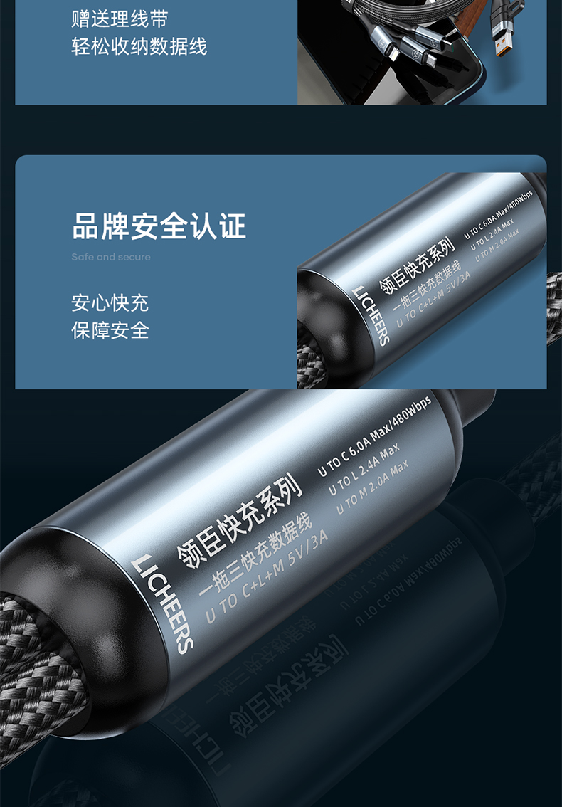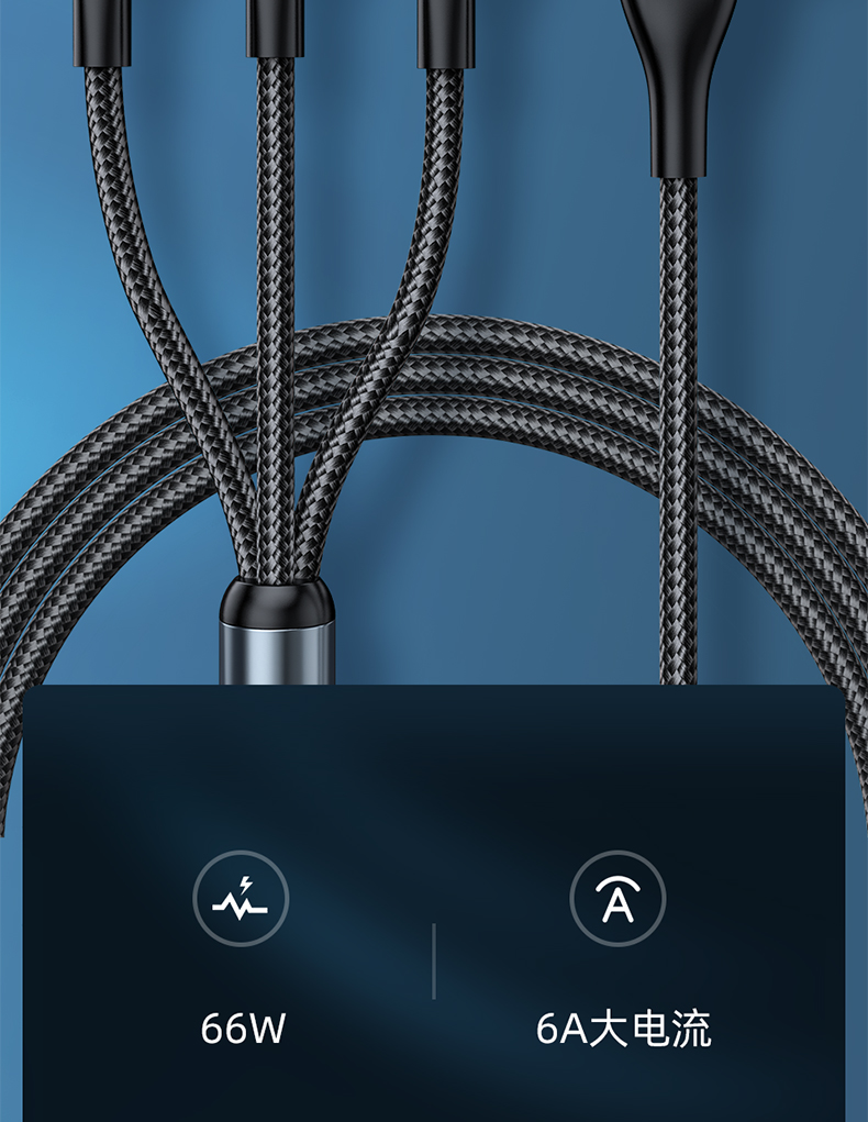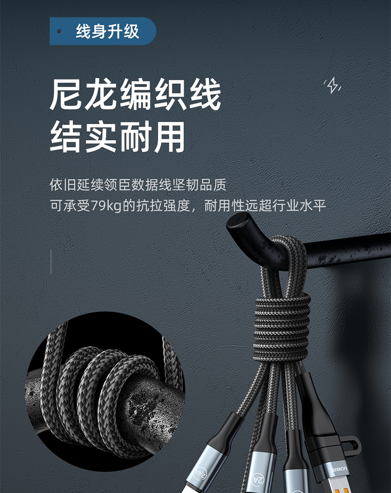 商品名称:领臣 LC-469 1.8米 二拖三超级快充数据线 锖色(单位:根)