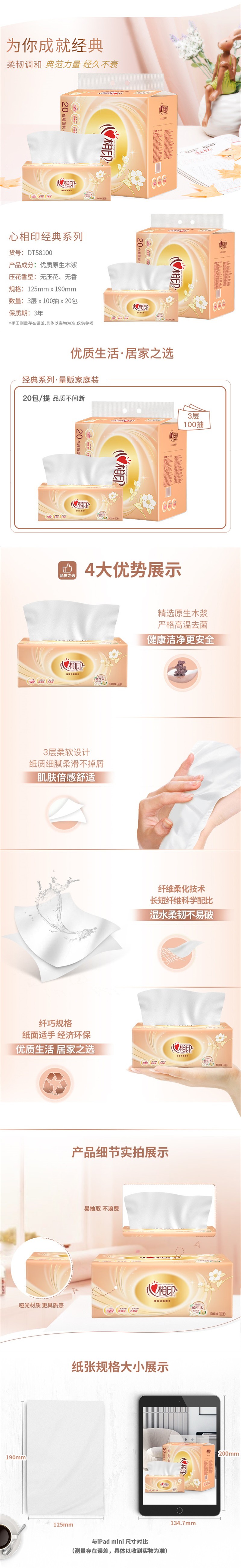 商品名称:DT23100(电商20包)心相印经典100抽三层塑装面巾纸