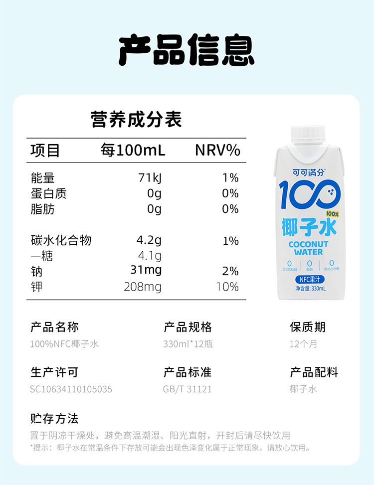 商品名称:可可满分椰子水330ml*12瓶