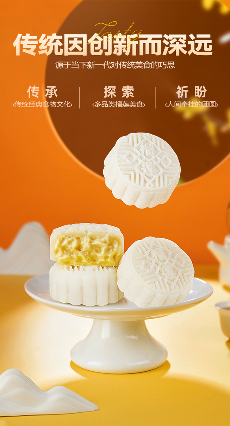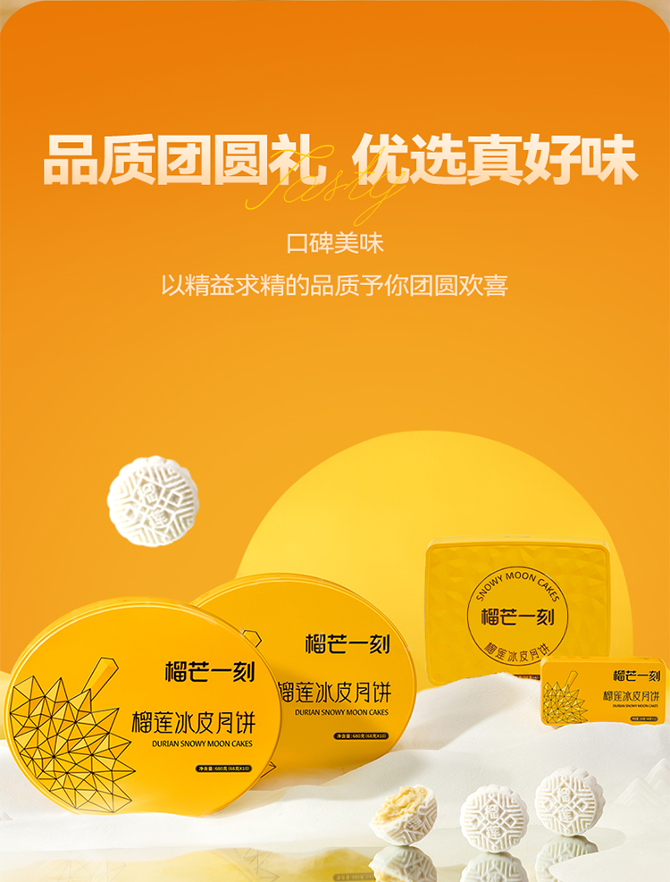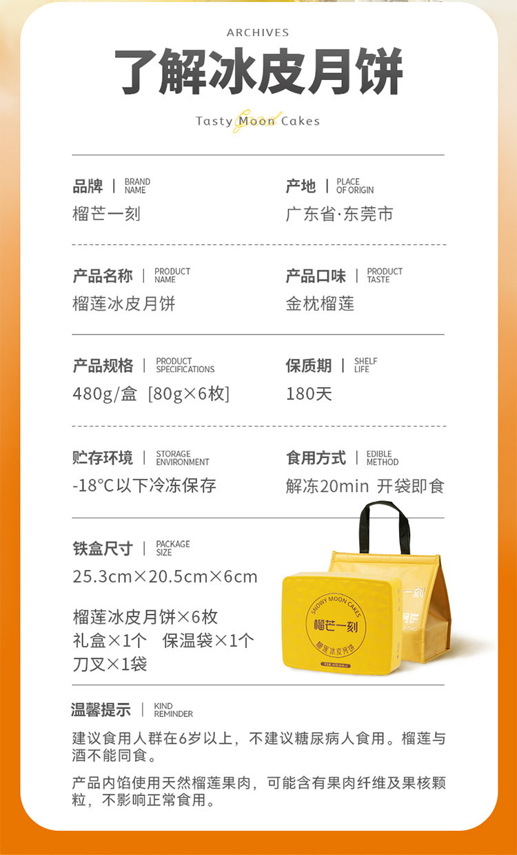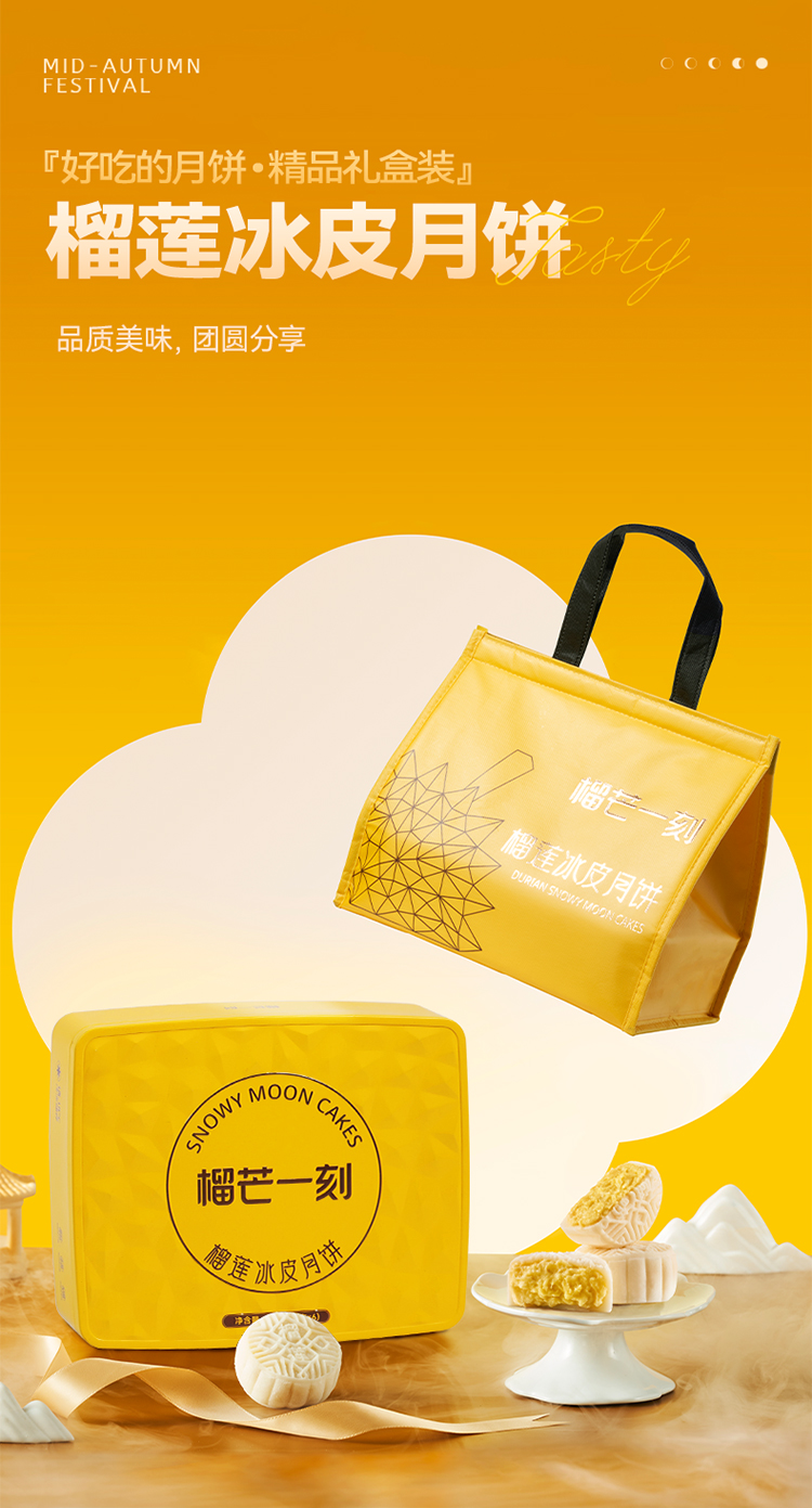 商品名称:榴芒一刻 金枕榴莲冰皮月饼80克*6枚/盒【含礼品袋】