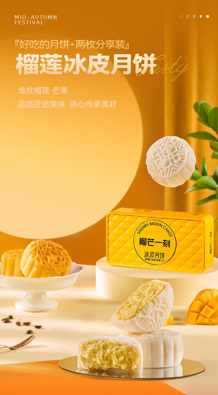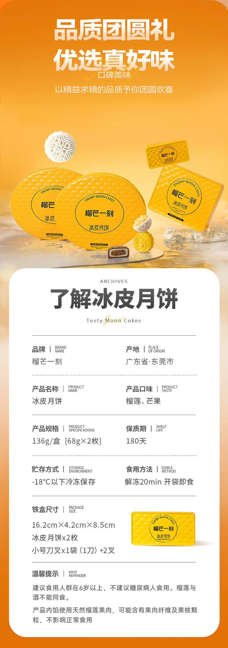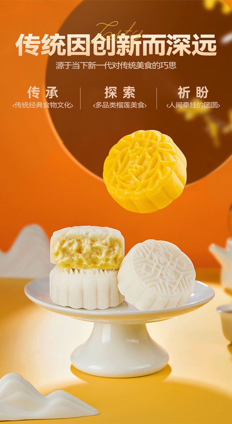 商品名称:榴芒一刻(金枕榴莲冰皮月饼+芒果芝士冰皮月饼68g*2枚)*2盒【无礼品袋】