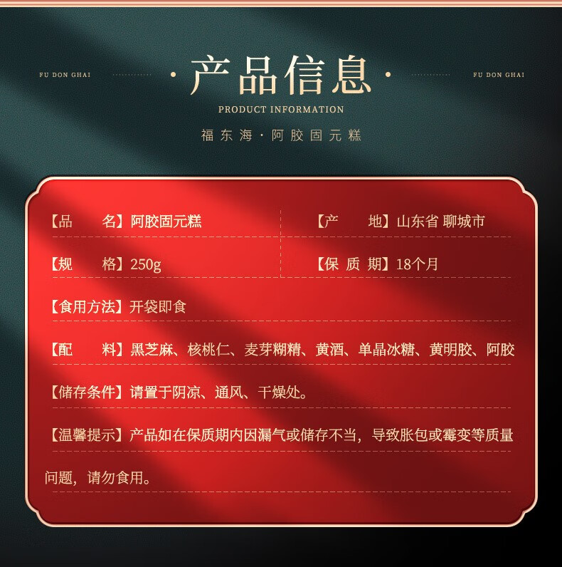 商品名称:【福东海】 阿胶固元糕250克*2盒