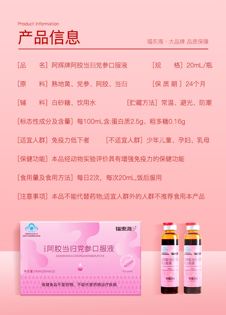 商品名称:【福东海】 阿胶当归党参口服液240ml*2盒