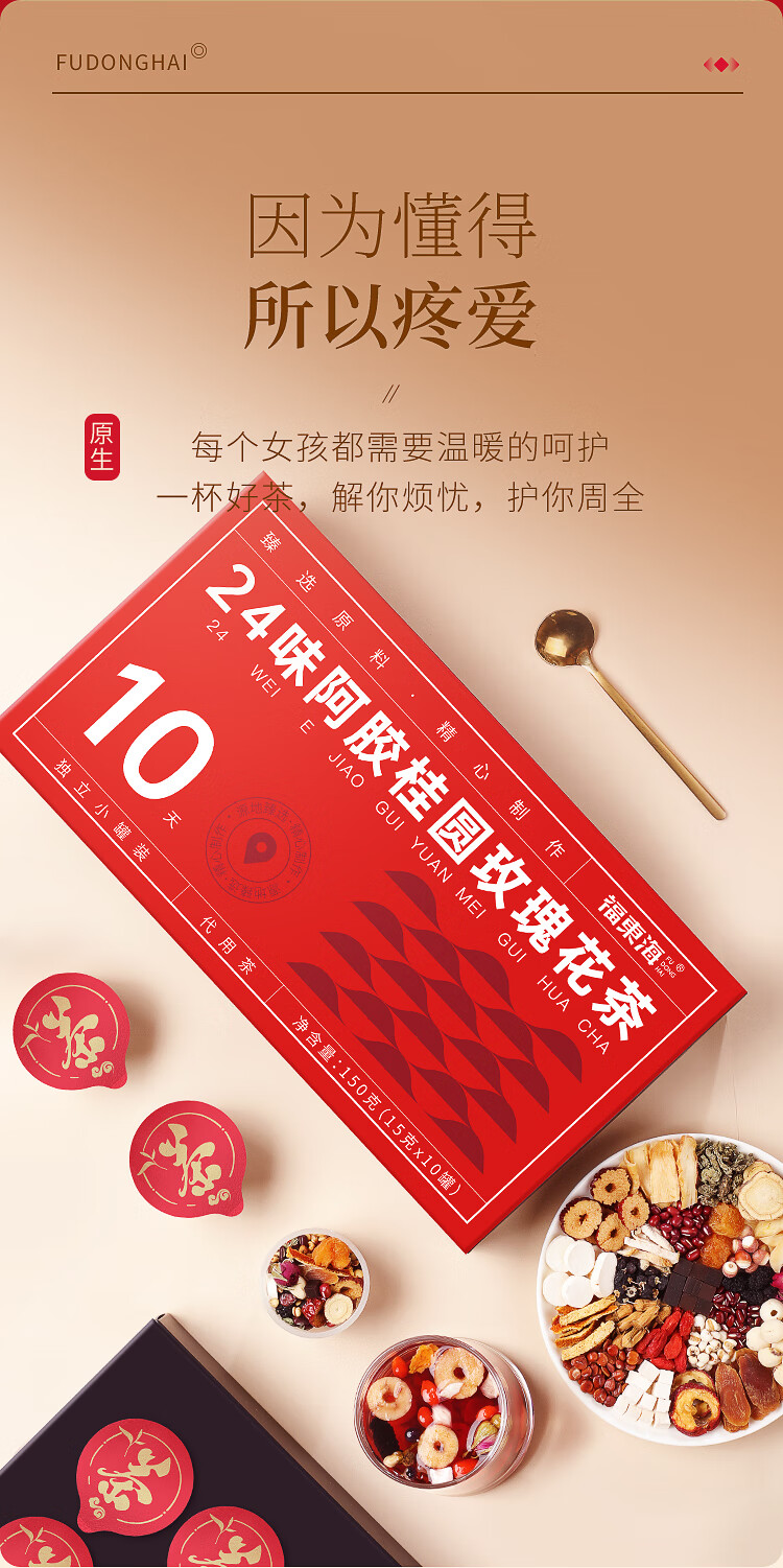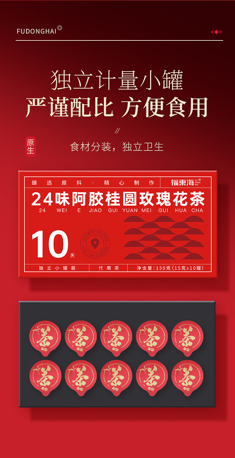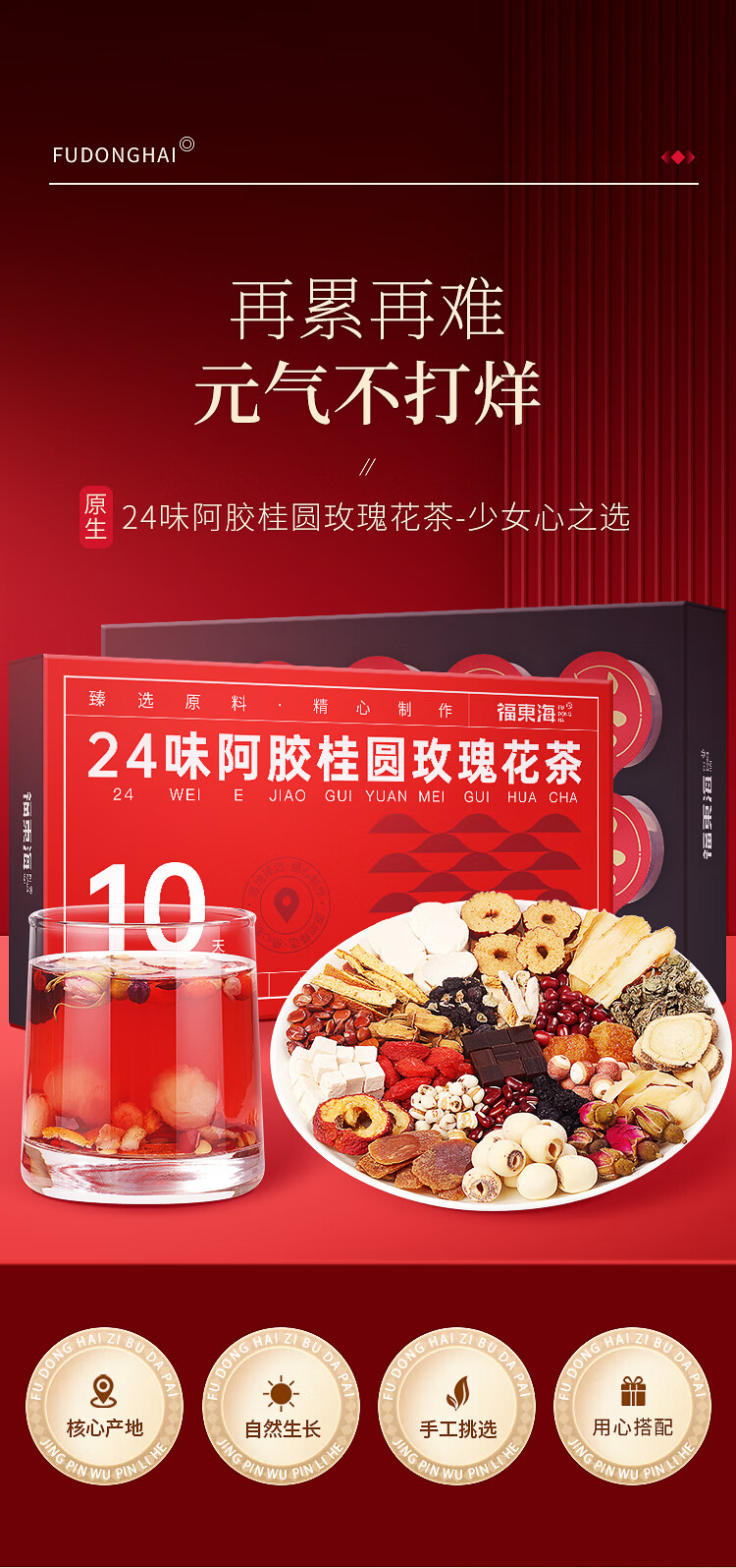 商品名称:【福东海】 24味阿胶桂圆玫瑰花茶150克*2盒