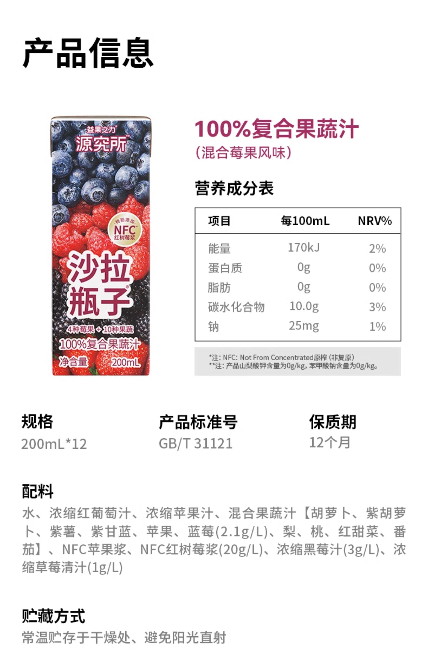 商品名称:源究所混合莓果汁饮料200ML*12/箱