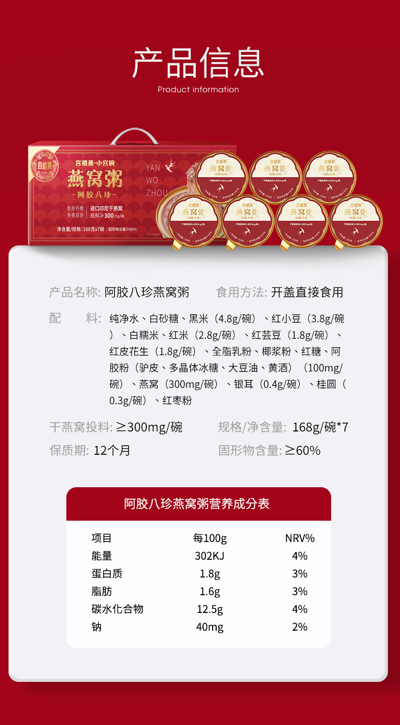 商品名称:阿胶八珍燕窝粥礼盒装 (168g*7 碗)/盒