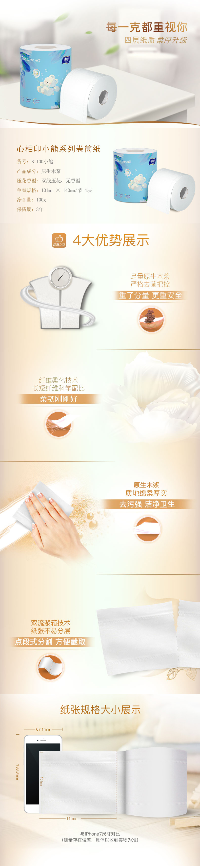商品名称:心相印BT100四层卷筒小熊x100克10粒x6提一箱 SYXXY007 (单位:箱)