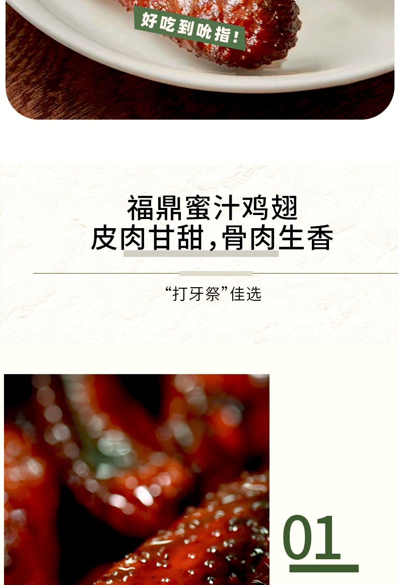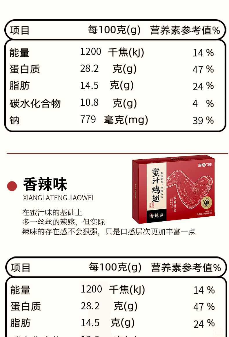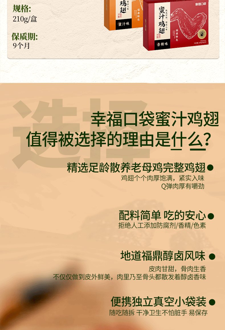 商品名称:幸福口袋福鼎风味蜜汁鸡翅香辣味210g*2盒装(单位:组)