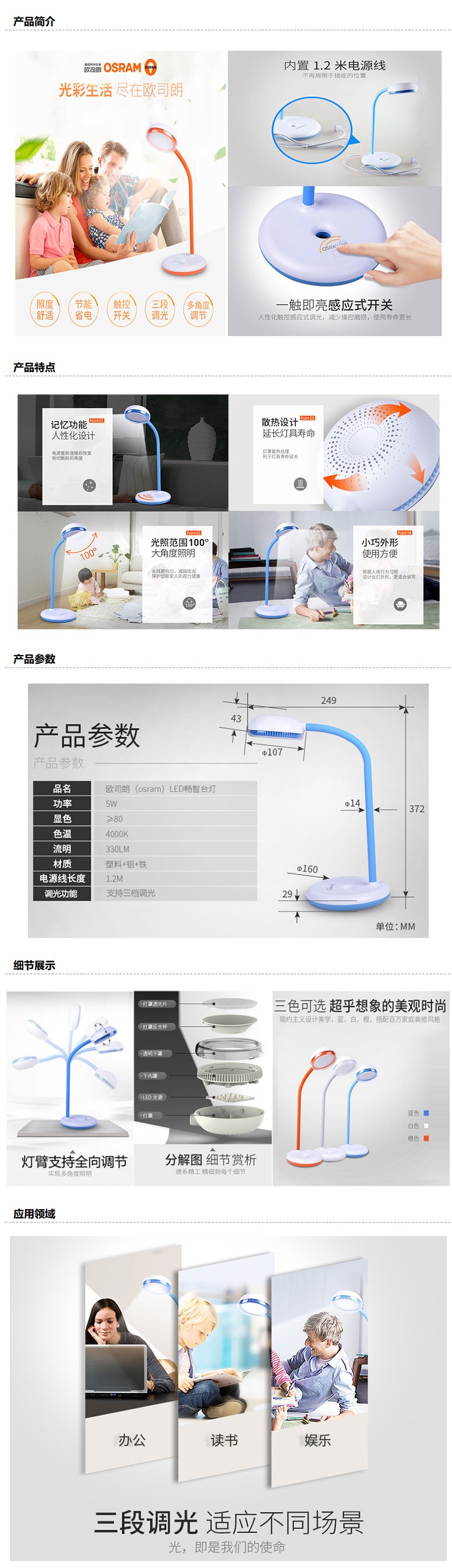 商品名称:欧司朗 LED 畅智三段调光台灯 5W 白/橙/蓝 颜色随机,单位:个