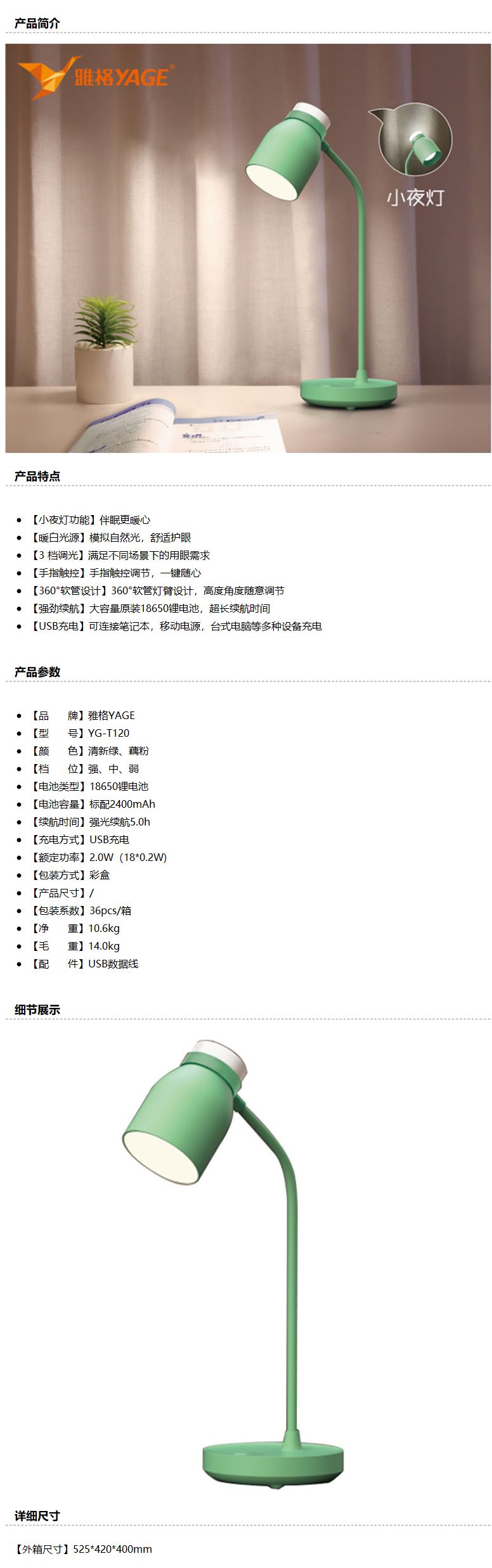 商品名称:雅格 复古台灯,小夜灯款,YG-T120,2400mAh,2W,触控,3档调光,绿色,单位:个