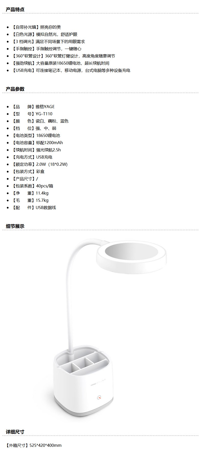 商品名称:雅格 笔筒台灯,补光镜款,YG-T110,2W,1200mAh,3档调光,白色,单位:个