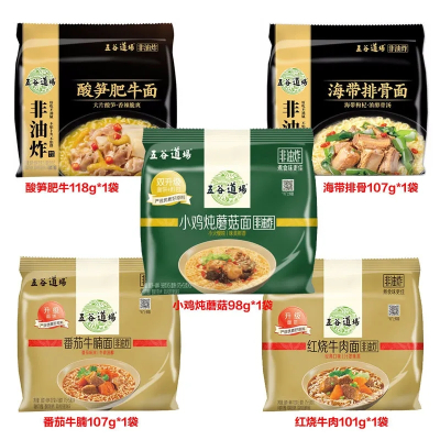五谷道场 酸笋肥牛+海带排骨+番茄牛腩+红烧牛肉+小鸡炖蘑菇面 5袋/(面饼+料包)(每款各1袋) 绿色