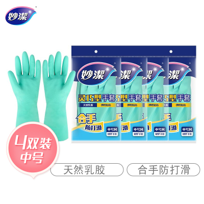 妙洁 清洁家务橡胶手套 中号4双装(灵巧型) 绿色