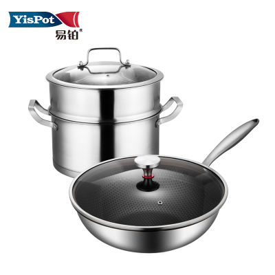 【yispot易铂】拉斐特两件套430食品级不锈钢26cm蒸锅+30cm炒锅YP-9016 不锈钢色