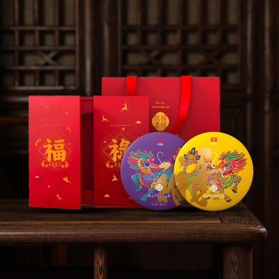 露华春 福禄双喜礼盒 生熟普洱茶组合357g*2饼 714g 红色