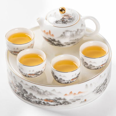 金镶玉 水墨江山一壶四杯羊脂玉瓷套装 本白色